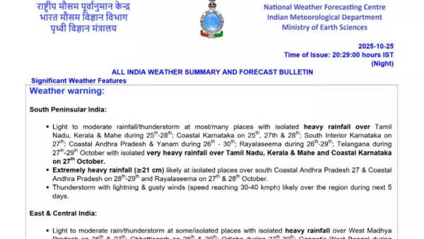 The (IMD) has issued an extensive forecast highlighting widespread rainfall, thunderstorms, and strong winds across multiple regions of the country through the end of October. As per the latest weather bulletin issued at 17:30 IST on October 25, 2025, two active weather systems, one depression over the east-central Arabian Sea and another in the southeast Bay of Bengal, are expected to dominate the country’s weather pattern over the next week.